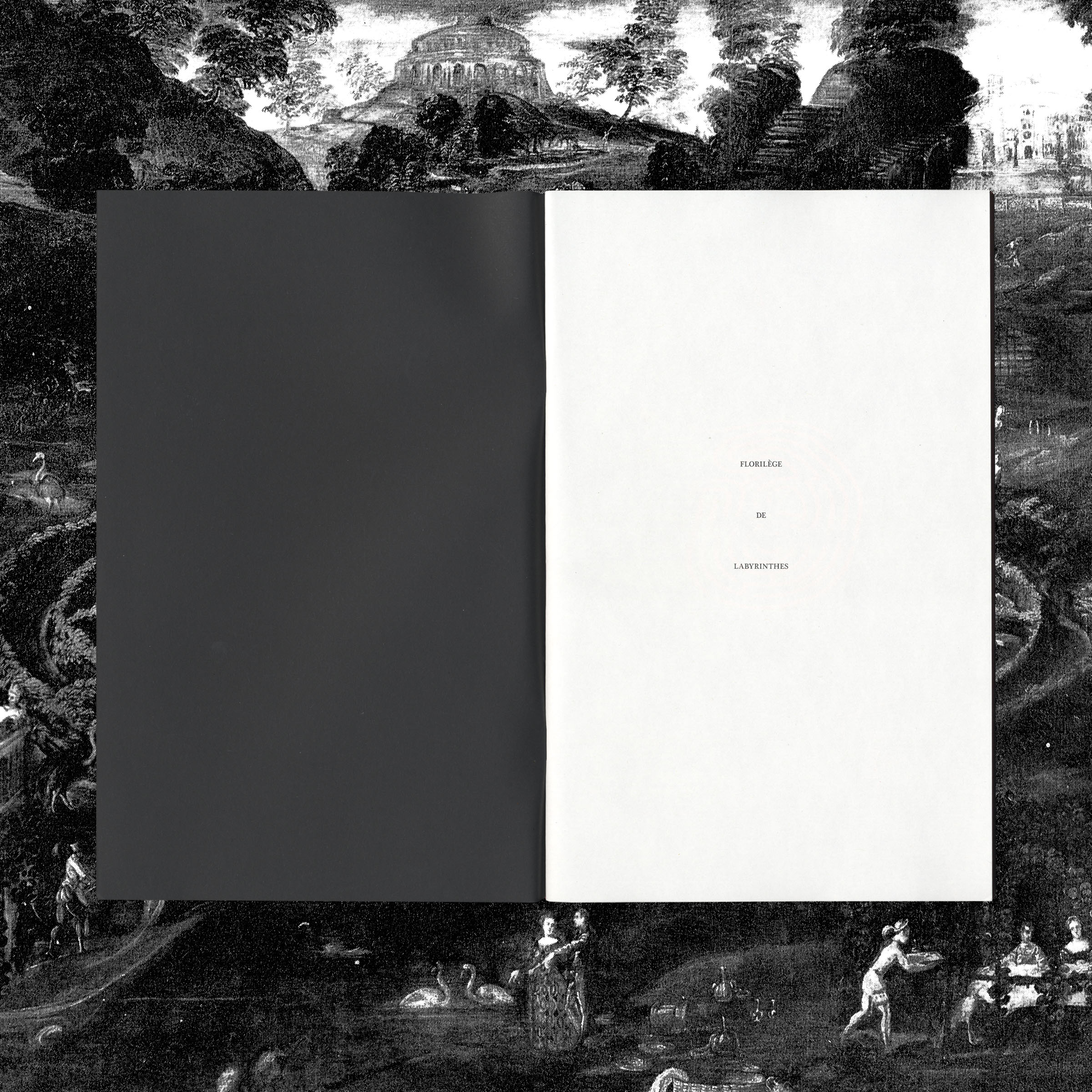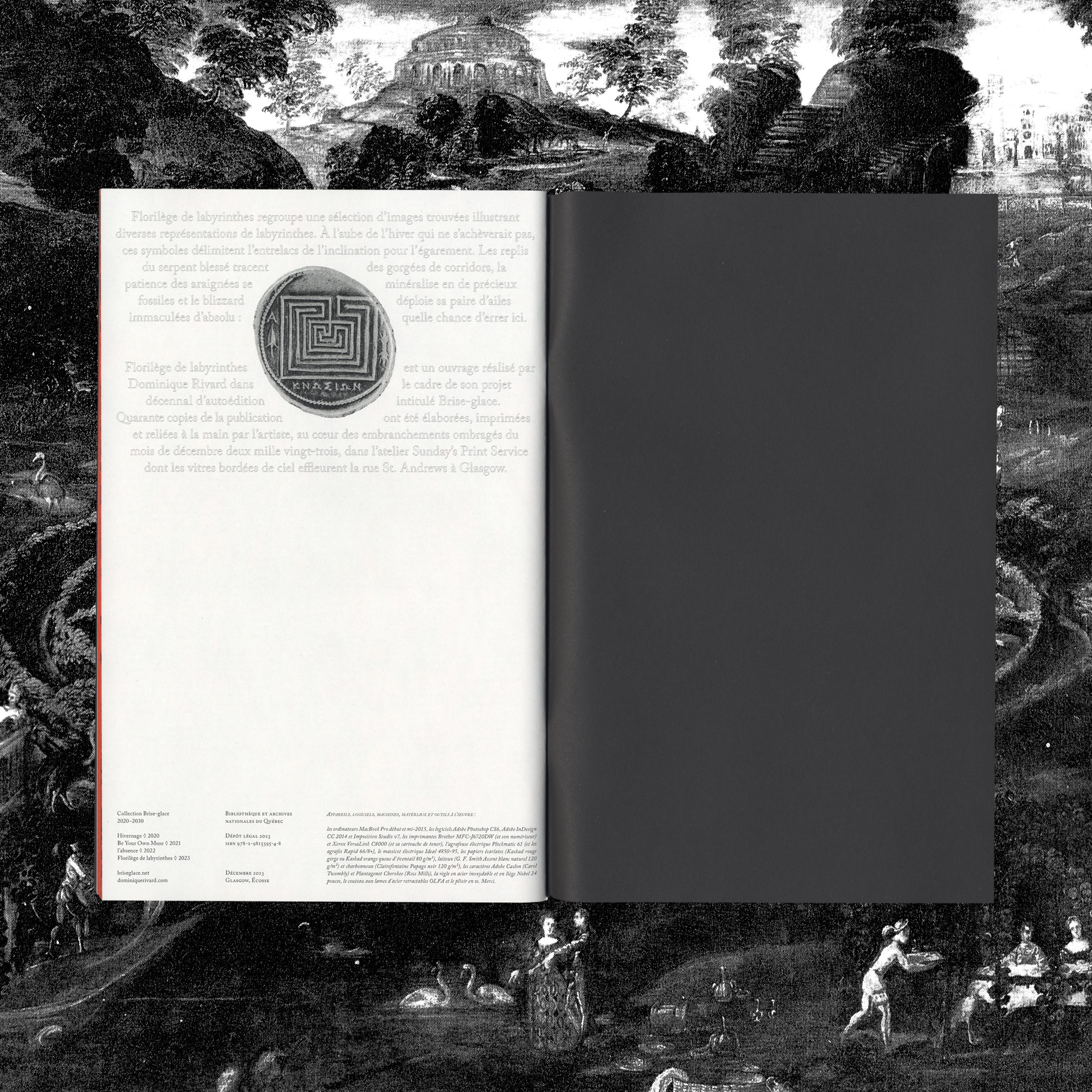 Florilège de labyrinthes est un ouvrage réalisé par Dominique Rivard dans le cadre de son projet décennal d’autoédition intitulé Brise-glace. Quarante copies de la publication ont été élaborées, imprimées et reliées à la main par l’artiste, au cœur des embranchements ombragés du mois de décembre deux mille vingt-trois, dans l’atelier Sunday’s Print Service dont les vitres bordées de ciel effleurent la rue St. Andrews à Glasgow.